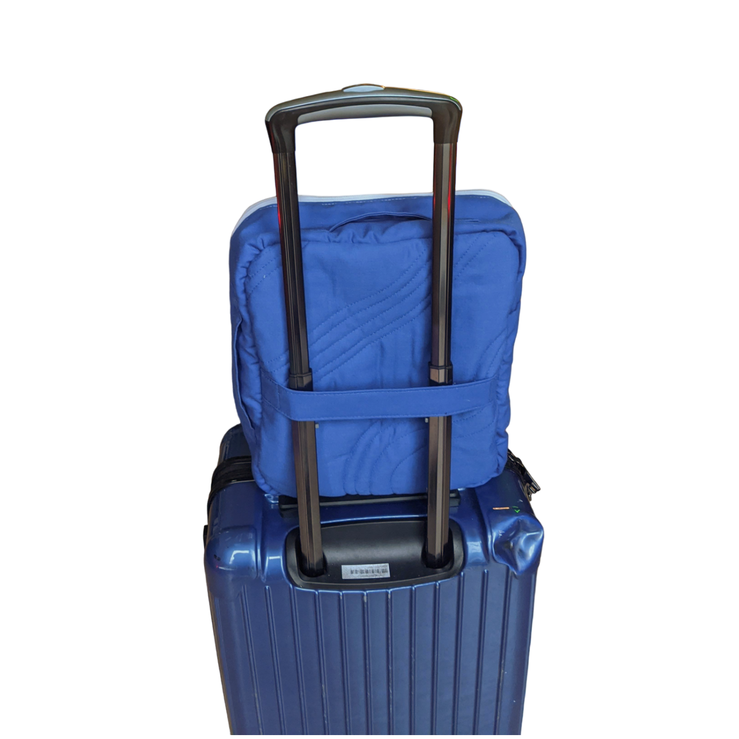 includes a 2 hand carry straps as well as a strap on the back to stack it on a suitcase for easy travel